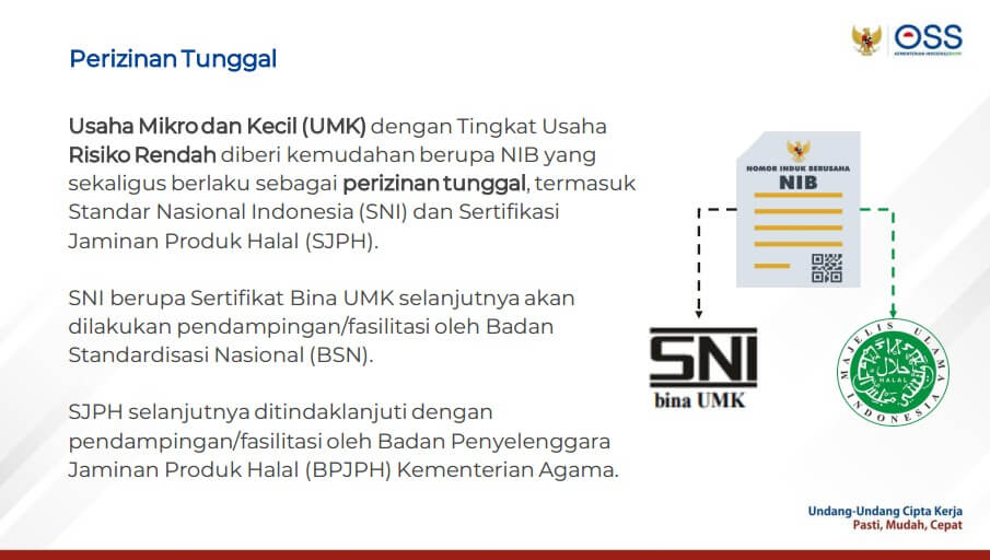 Usaha Mikro dan Kecil (UMK) dengan Tingkat Usaha Risiko Rendah diberi kemudahan berupa NIB yang sekaligus berlaku sebagai perizinan tunggal, termasuk Standar Nasional Indonesia (SNI) dan Sertifikasi Jaminan Produk Halal (SJPH).